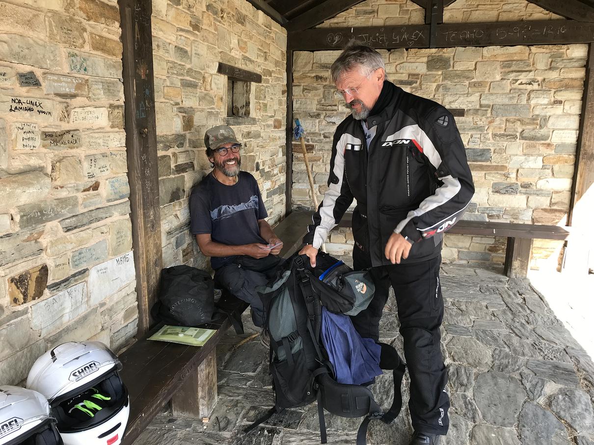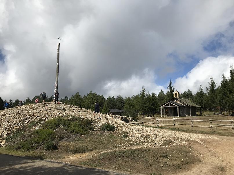 Les pélerins se bousculent pour établir le record : 240 aujourd'hui. Encore de grandes lignes droites ou la moto demande toujours plus de gaz, et puis après Astorga c'est la montagne. Une aire de repos est aménagée en haut du col à 1500m. Ici un énorme tas de pierres avec au centre une grand croix de fer. Cet endroit est connu des pélerins. En principe chacun doit y amener une pierre depuis chez lui, cette pierre symbolise les soucis, les voeux, etc... Mais la plupart des pélerins prennent une pierre juste en arrivant et la posent là.