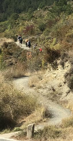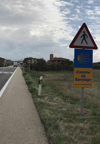 A quelques km de Pampelune, une aire de stationnement, des dizaines de pélerins traversent la route pour rejoindre le camino de l'autre côté, la plupart sont à pied, certains en vélos.