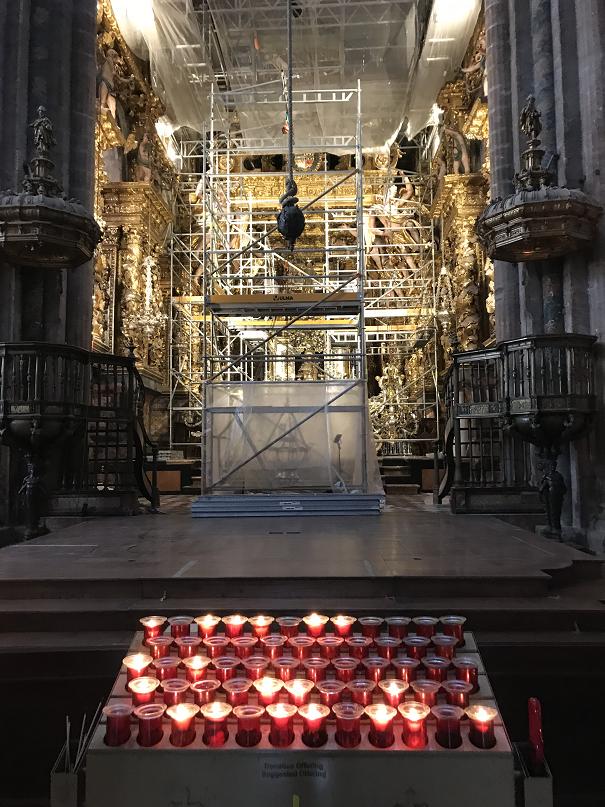 Pour terminer notre séjour dans la ville des Jacquets, nous assistons à une messe en espagnol dans une chapelle de la cathédrale. On s'est laissé enfermer dans la chapelle pendant la répétition des chanteurs et puis finalement on assiste à la messe. Le curé se lance dans un long monologue. A part plusieurs "... camino Santiago..." on n'y comprend rien. Puis deux petites filles s'approchent du curé, il fait le signe de croix sur leurs fronts. C'est un baptème. Sur l'Ave Maria.