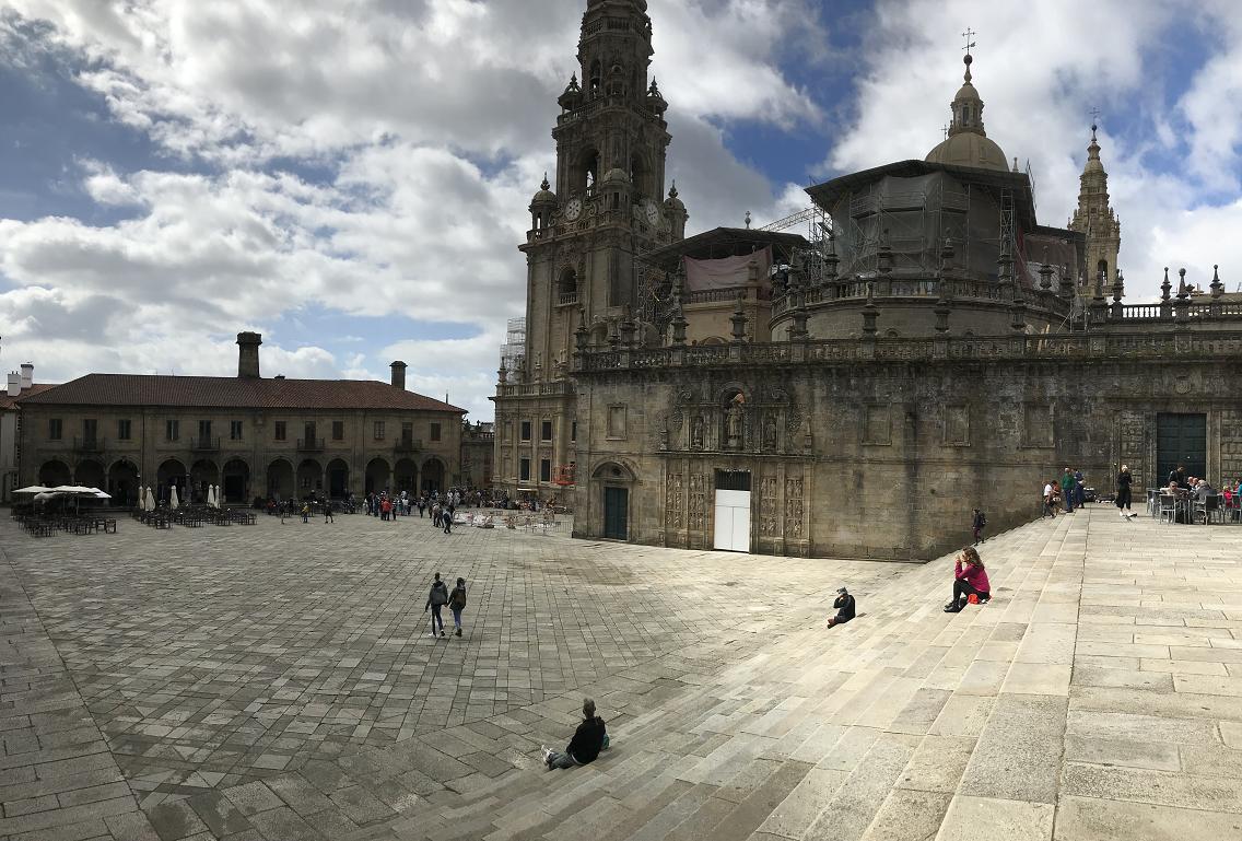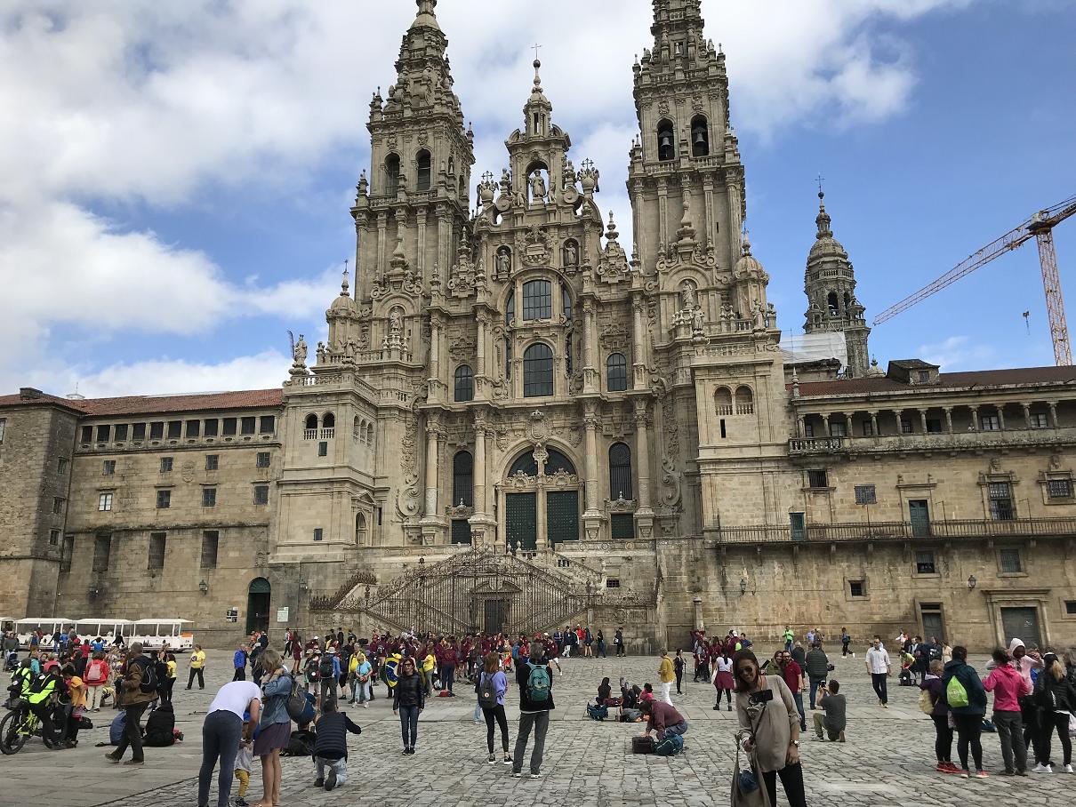 La joie. Sur la place de l'Obradoiro passe un groupe de personnes agées qui suit un guide tenant un parapluie levé. De jeunes pélerins joyeux avec sacs à dos et coquilles qui pendouillent, des gamins d'une école tous habillés de bleu (le teeshirt Camino avec une flèche jaune), un groupe de jeunes portugais chantants tout de mauve vêtus avec en tête plusieurs jeunes filles portant une grande croix ou une multitude de petits rubans multicolores sont attachés.
