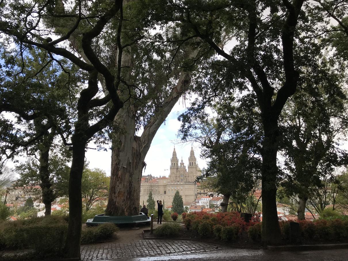 La cathédrale vue de loin depuis un parc où se trouve un immense eucalyptus.