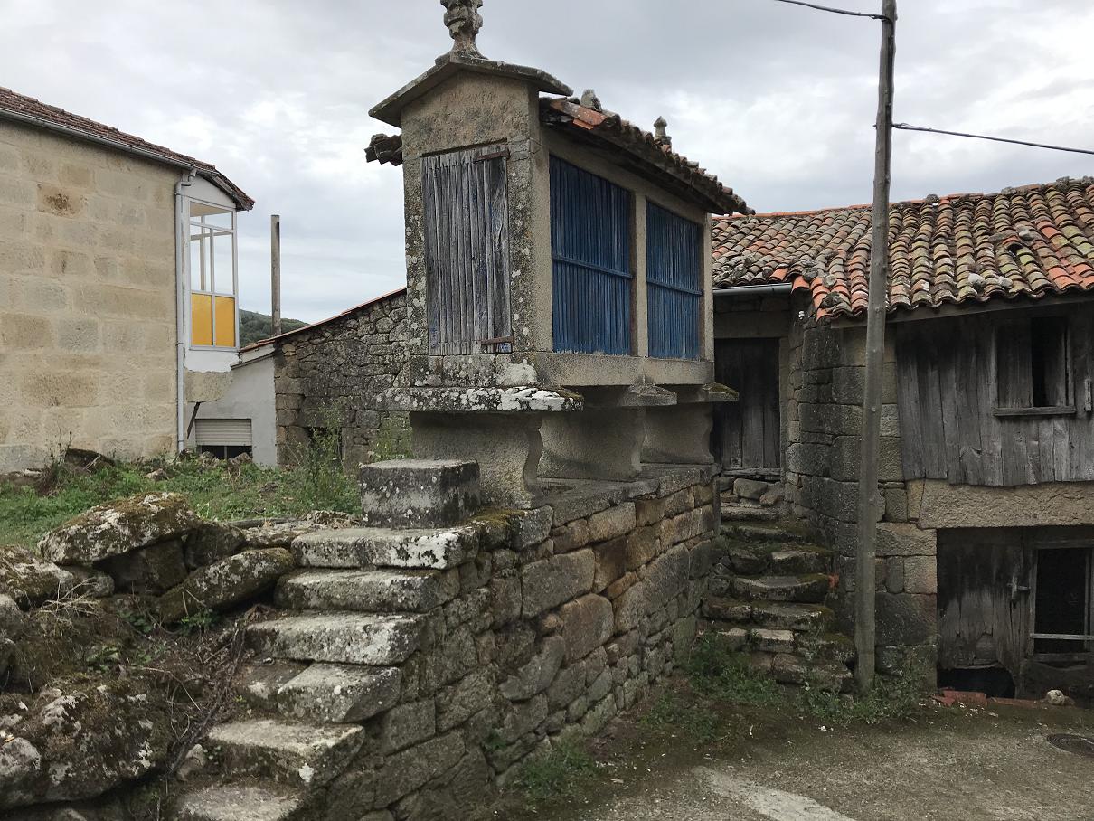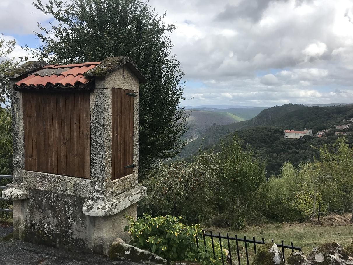 Vu dans un village quasi abandonné en Galice dans les gorges du Sil, ce sont de petits greniers destinés à stocker des céréales, les horrèos, à l'abri des rongeurs. Dans la photo de droite on distingue au loin le monastère de San Estevo.