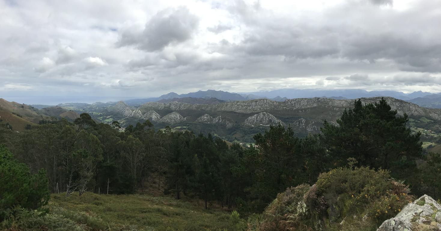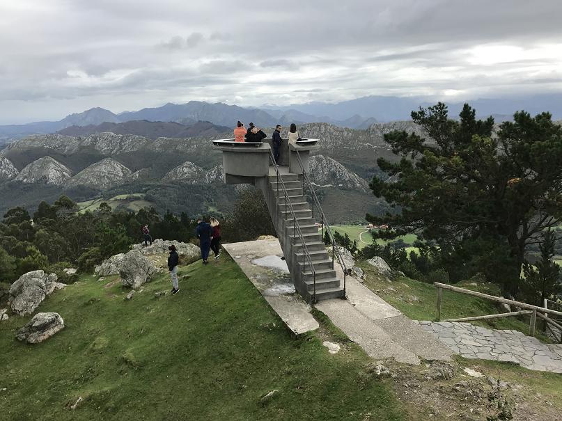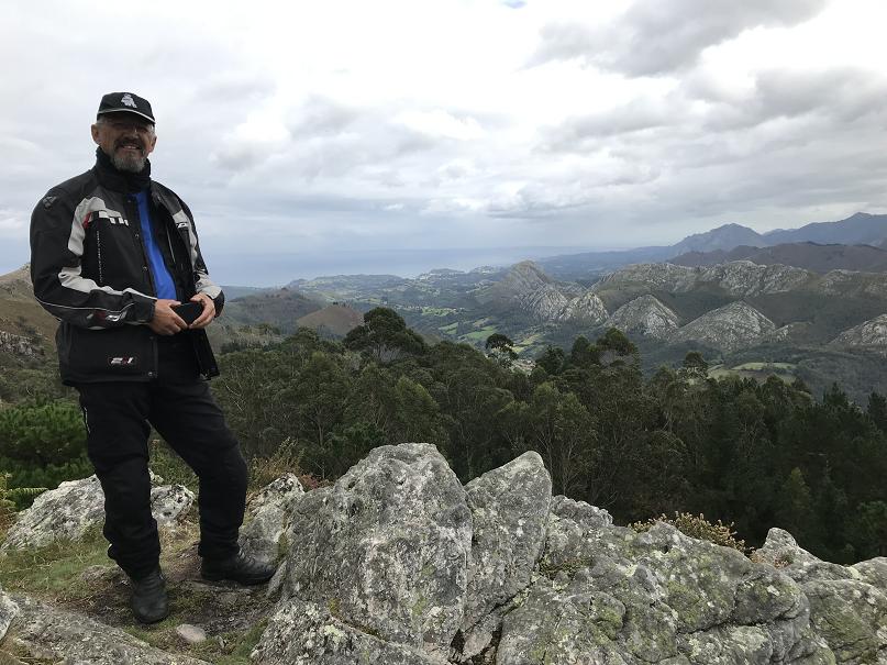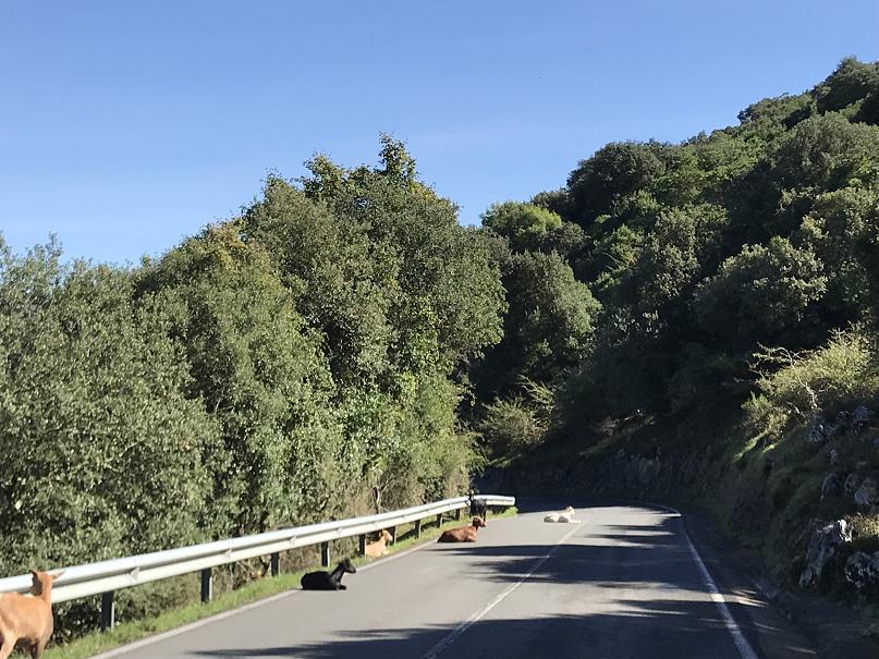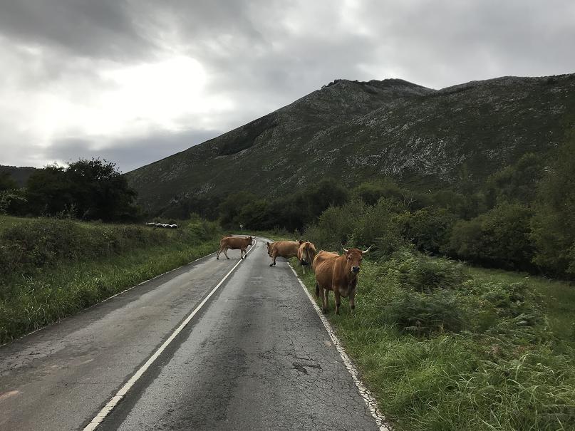 La pause casse croûte nous fait découvrir le "Parque National de Picos de Europa" au "mirador del El Fitu" avec une vie à 360° sur la côte et les dents acèrées des pics asturiens. Les vaches et les chèvres nous accueillent bien gentiment sur la route.