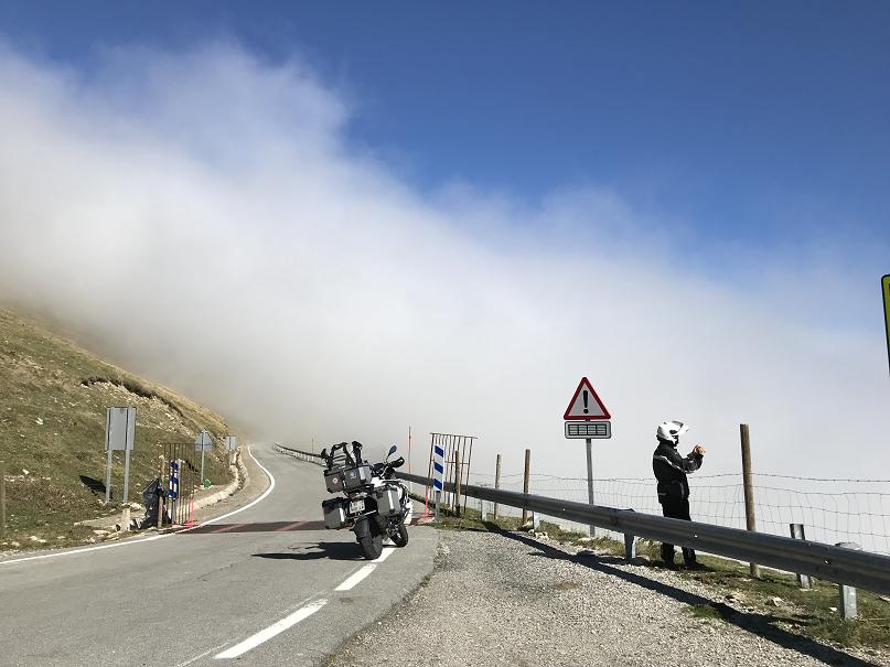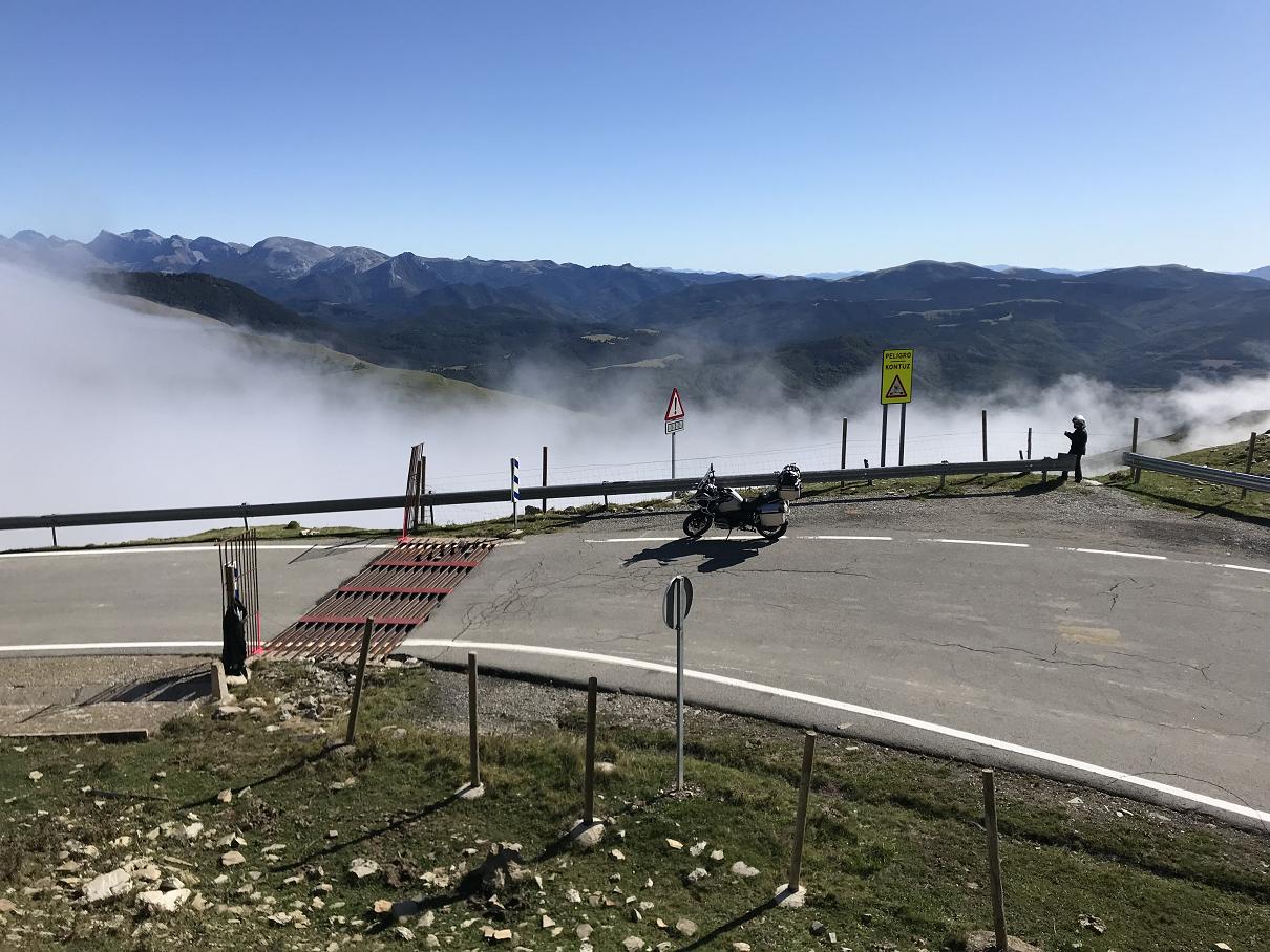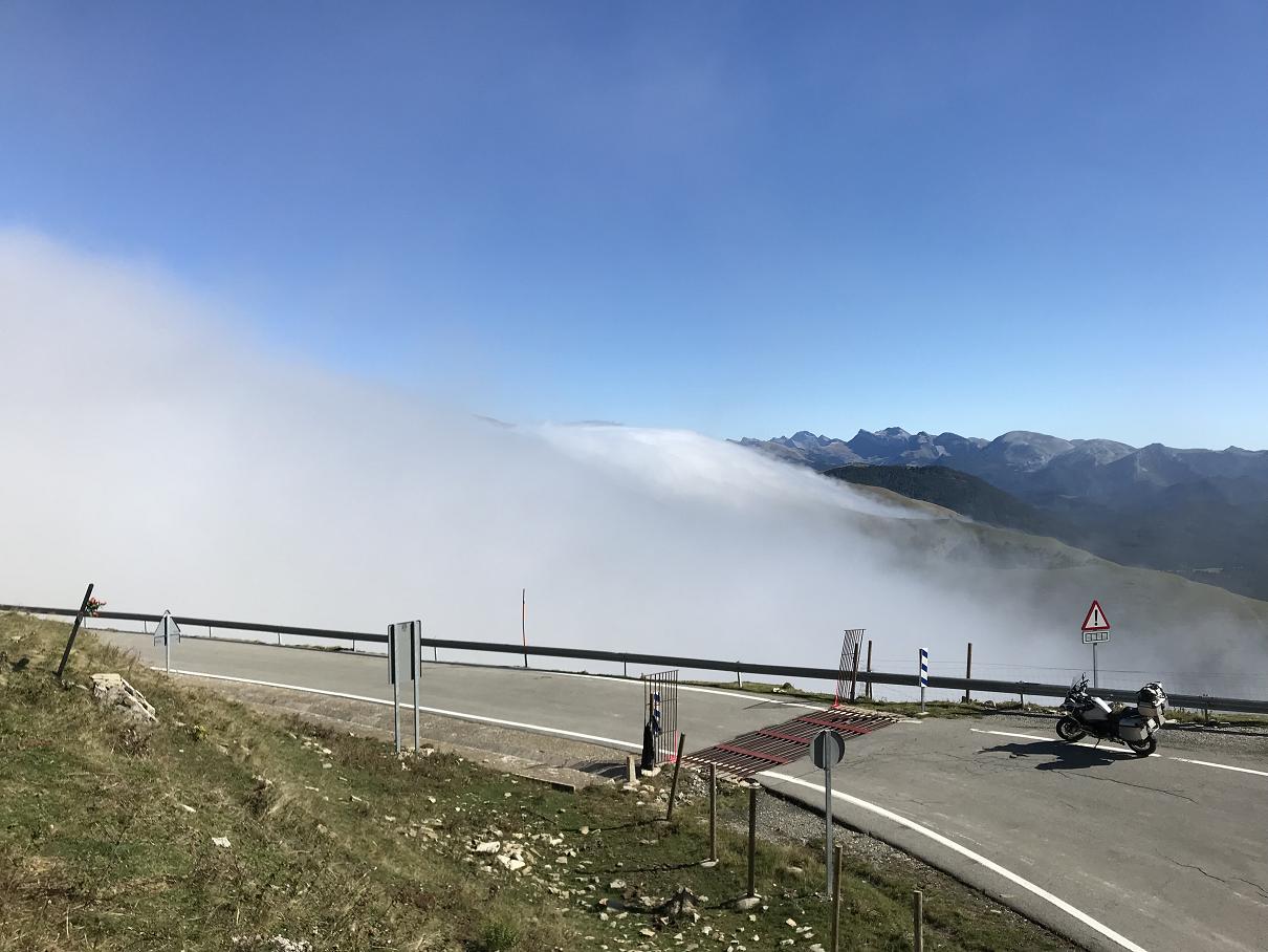 Ciel bleu sur l'Espagne. Puis à la frontière au col Port de Larrau à 1573m, les nuages français se déversent sur le coté espagnol en une lente couverture glissante. On est à la fois dans le bleu du ciel et dans le gris des nuages. Magique... Puis en redescendant côté français c'est la purée de pois.