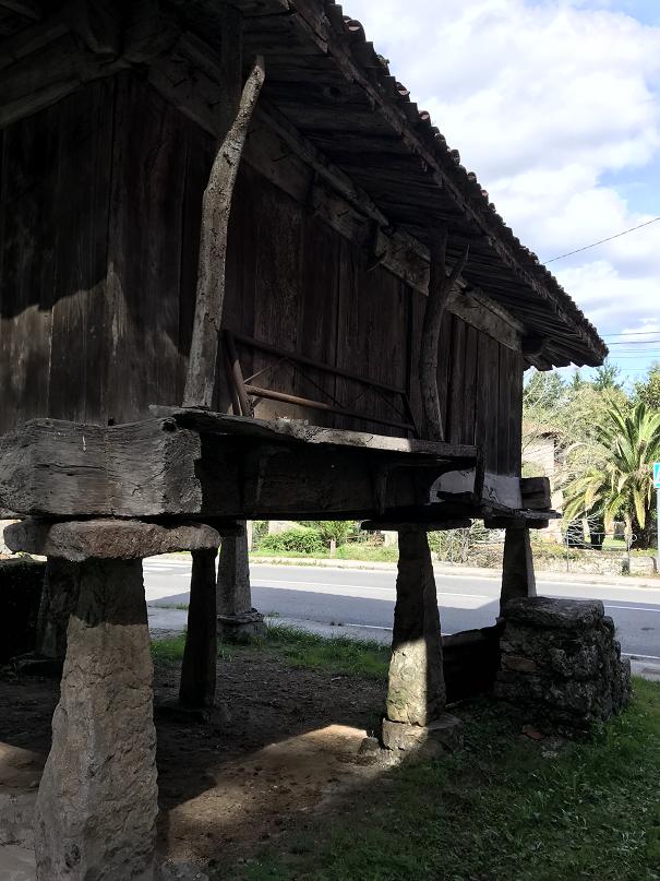 Les Asturies. Région montagneuse, les pommiers à cidre sont chargés à craquer, de petits champs de maïs apparaissent ça et là. De loin on dirait des ceps de vigne mais en approchant on devine autre chose, c'est bien clairsemé, vert tendre, ce sont des rangées de haricots. Et puis on retrouve des horrèos d'une autre structure, carrés sur pilotis de pierre.