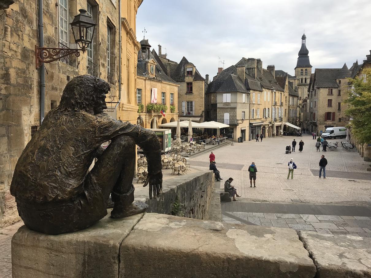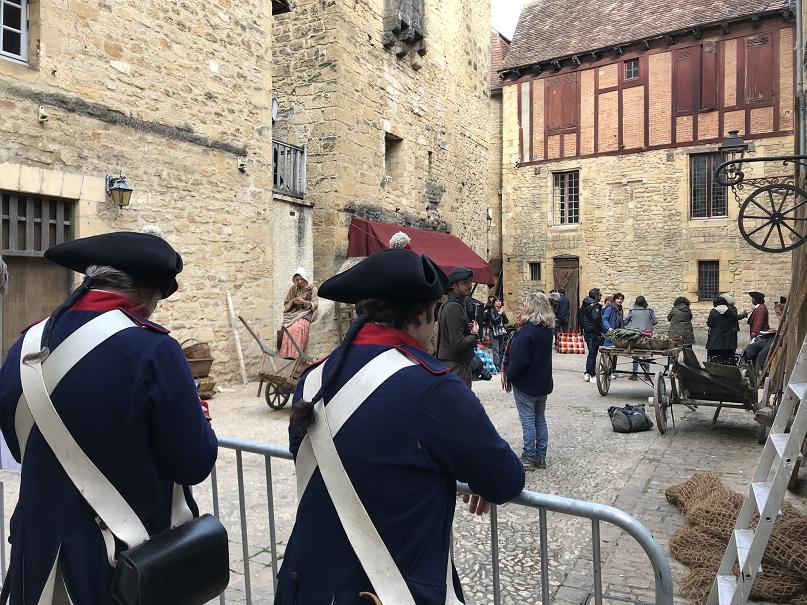 Quelques rues sont interdites aux passants à Sarlat. On tourne un film documentaire sur la Révolution. La place principale de Sarlat.