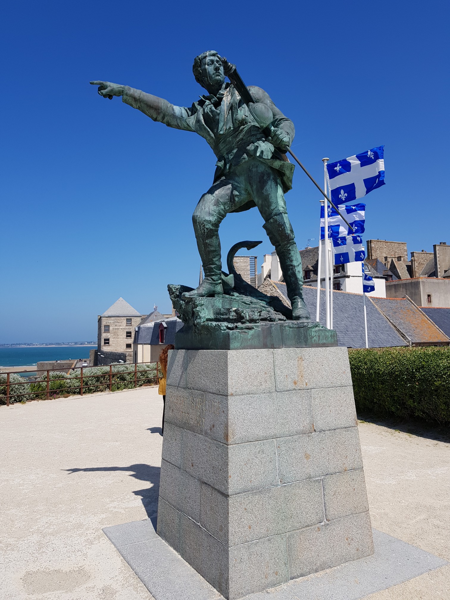 Derrière la statue, les fiers drapeaux du Québec que Jacques Cartier natif de Saint Malo a découvert en 1534.