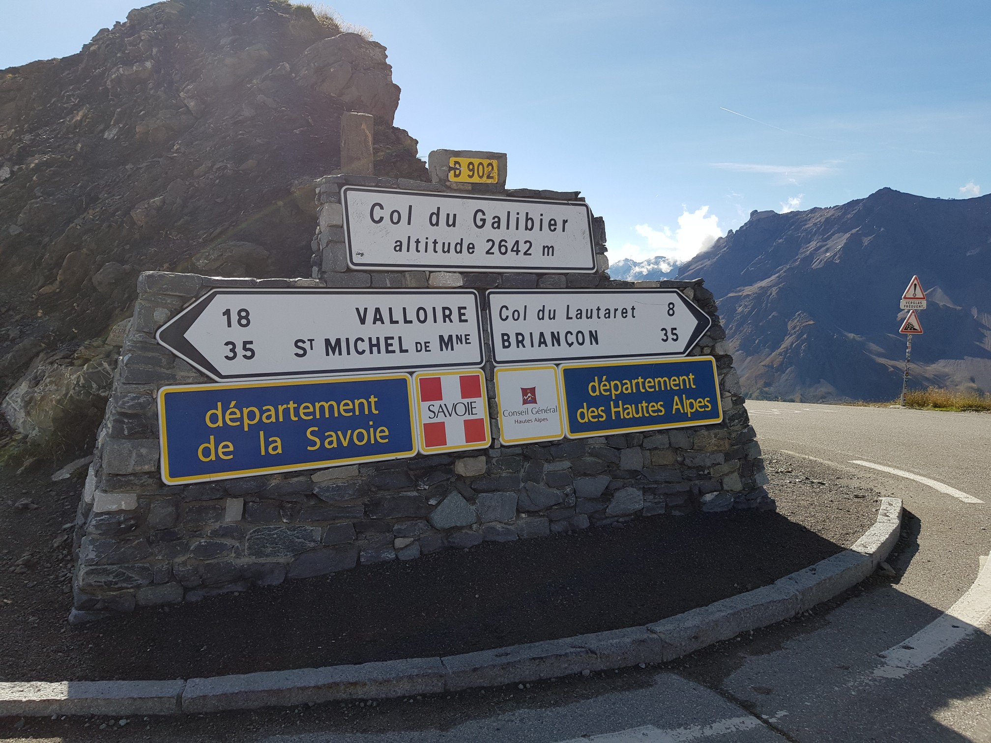 C'est la journée pour enchaîner les cols : col du Télégraphe, col du Galibier, col du Lautaret, col d'Izoard, col de Vars. Une merveille avec la chouette passagère qui fait hou-hou de temps en temps. C'est vrai que la route frôle les à pics. Les motards sont nombreux, beaucoup d'allemands. A l'approche des cols un photographe nous prend en photo dans une épingle. Ce que c'est que la célébrité ! Ah bon c'est du bizeness, faut aller voir les photos sur un site et les payer bien sûr...