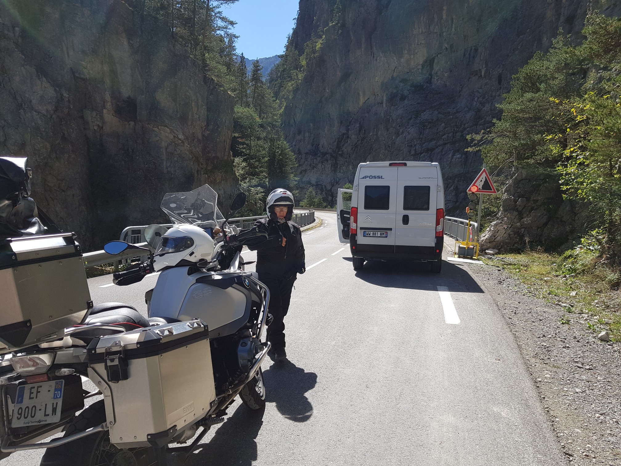 Route bloquée jusqu'à 17h par des éboulis avant Guillestre. On attend un peu et finalement on nous indique qu'on peut passer.