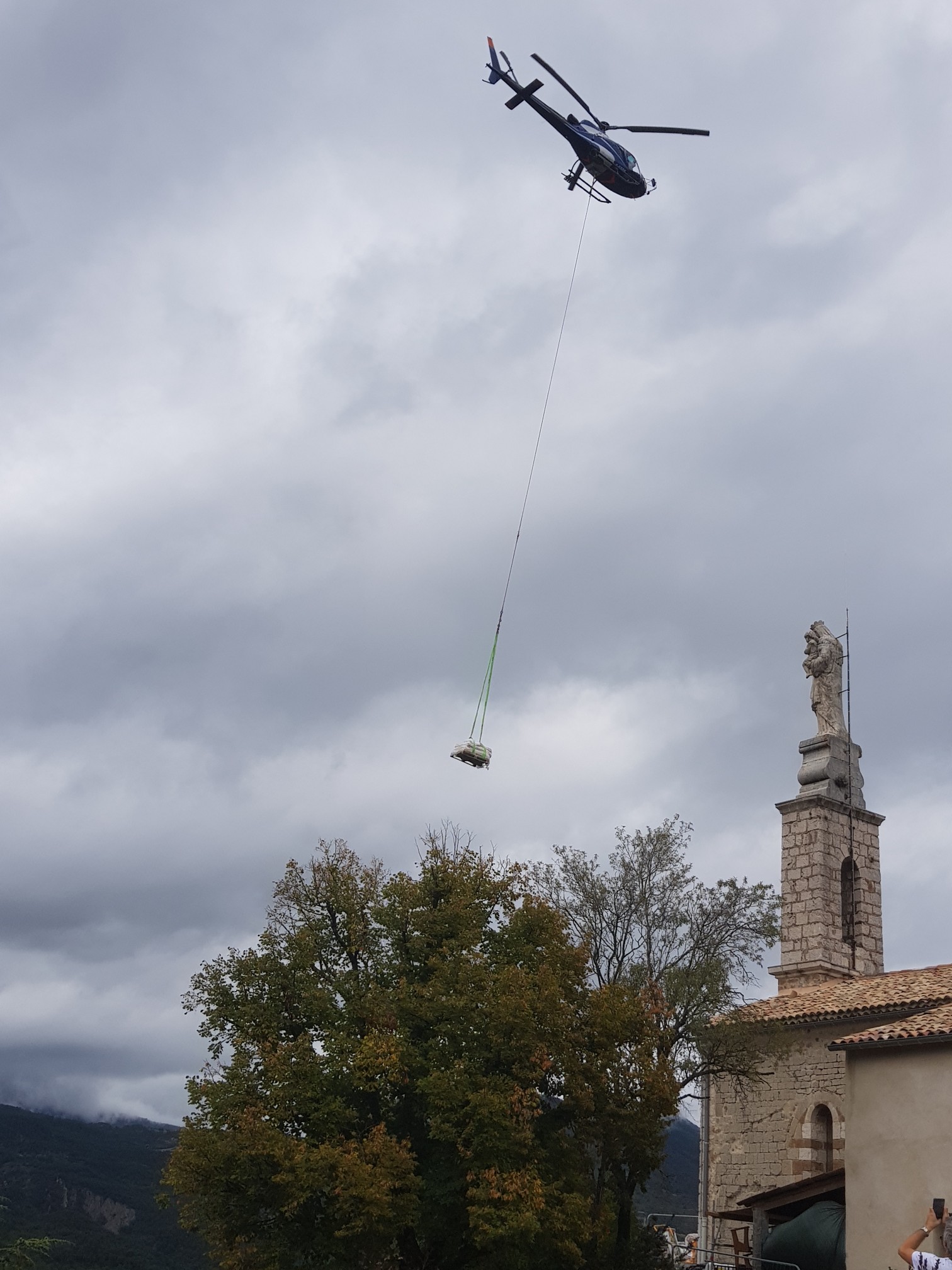 La chapelle en rénovation, évacuation des déchets par hélicoptère. Faut viser juste !