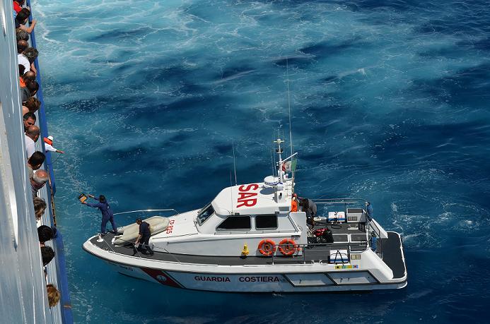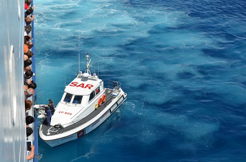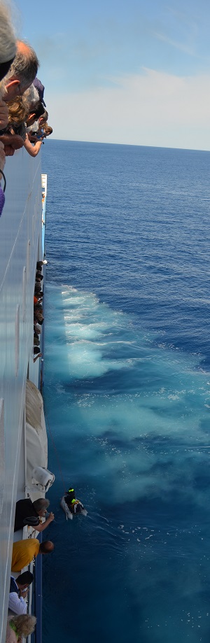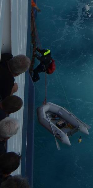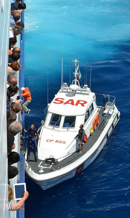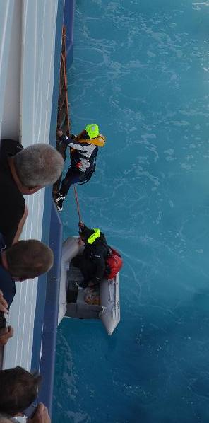 Une heure plus tard, le ferry s'arrête à nouveau, car les Gardes Côtes Italiens viennent récupèrer les naufragés... et leur Zodiac. On remarquera sur une photo le nouveau mode de prise de vue : avec une tablette numérique... pratique ?