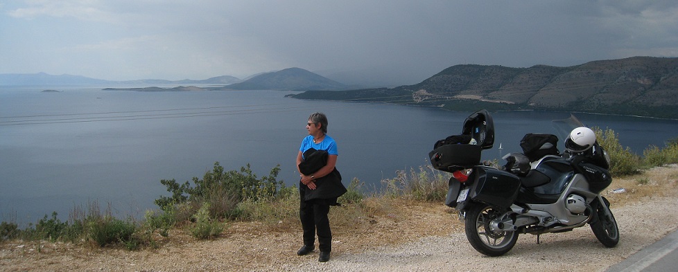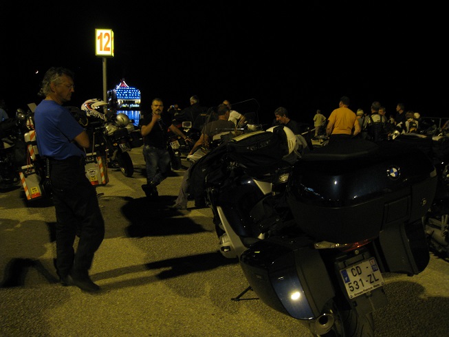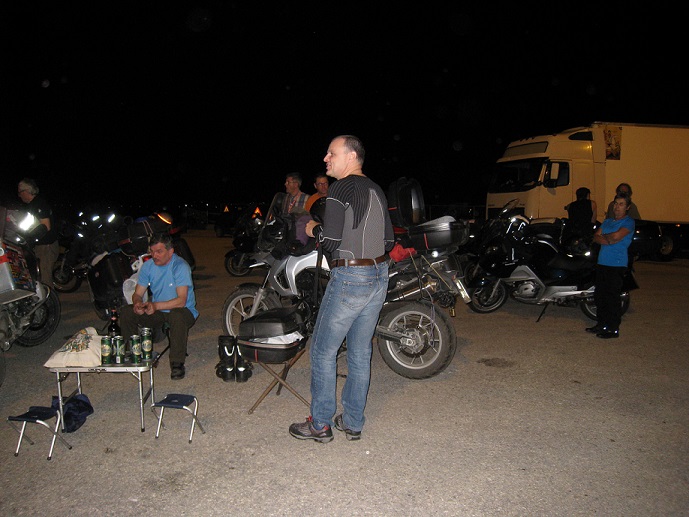 Et puis c'est 3 heures d'attente... On en profite pour sympathiser avec un couple de Grenoblois, Didier et Lydia. On remarquera l'organisation sans faille des motards Slovènes : petite table bien garnie et mini tabourets
