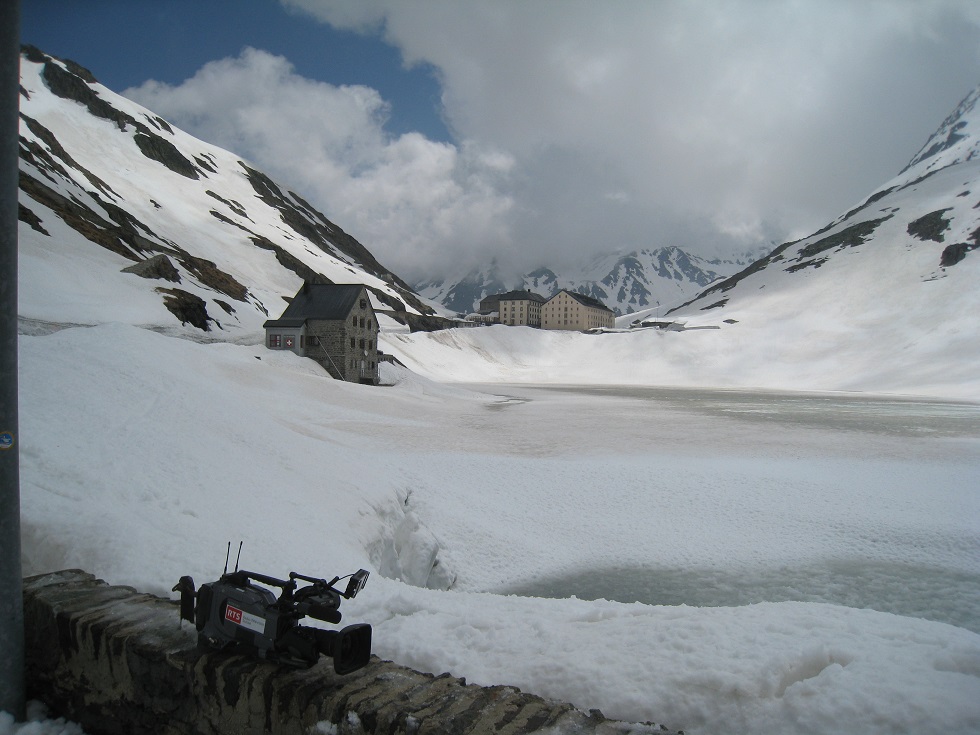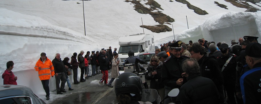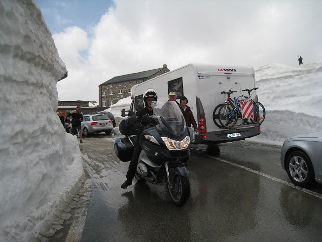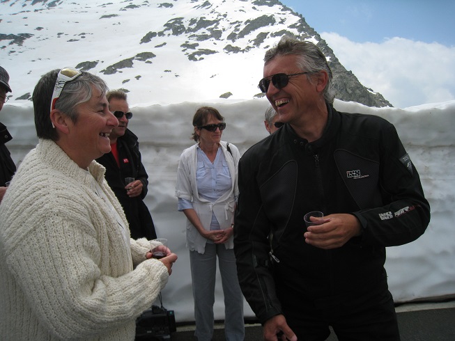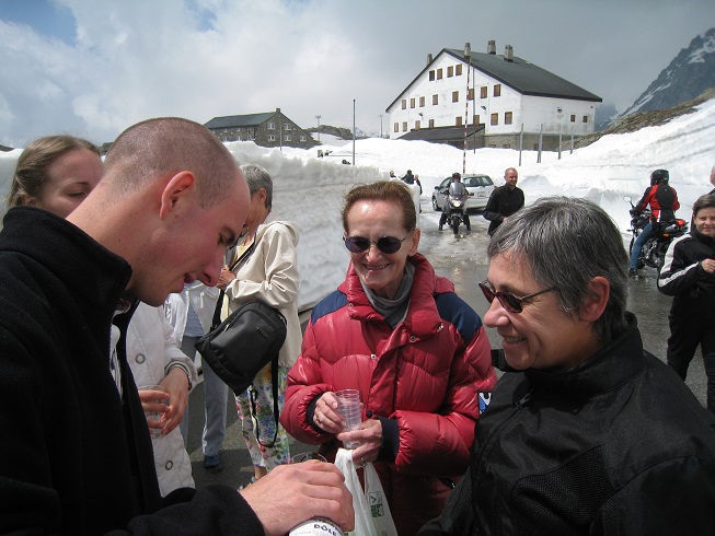 Passer par le col du Grand St Bernard est un must de la rando moto. En bas du col un panneau indique "CHIUSO" (fermé), mais on essaie quand même. Et puis en haut à 2500m c'est la surprise : on arrive pile le jour et à l'heure de l'ouverture du col après 7 mois de fermeture. Une réception est organisée par les résidents du coin (communauté de chanoines et laïcs engagés associés) et les télés italienne et suisse sont là. Le col est dégagé mais il reste 50 mètres de route glissante, neige et glace. Un peu de frayeur quand la moto se met en travers, mais ça passe quand même.