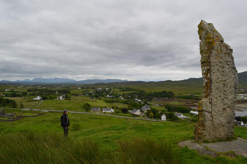 A Flashader notre hôte Robin est un ancien motard qui malheureusement a eu un accident de moto et perdu la mobilité du bras gauche. Une erreur de jeunesse ou il roulait trop vite sur sa Kawa. Le courant passe quand on parle moto même si on a du mal à comprendre ce qu'il dit. Il nous indique les petites routes à prendre sur l'ile. Pour commencer on passe vers le chateau des MacLeod, au cimetière les plaques tombales des MacLeod avec celle du dernier en date le 29e chef du clan MacLeod. Une pierre levée sur le village des MacLeod Dunvegan, avec vue sur le cimetière à gauche de la photo.