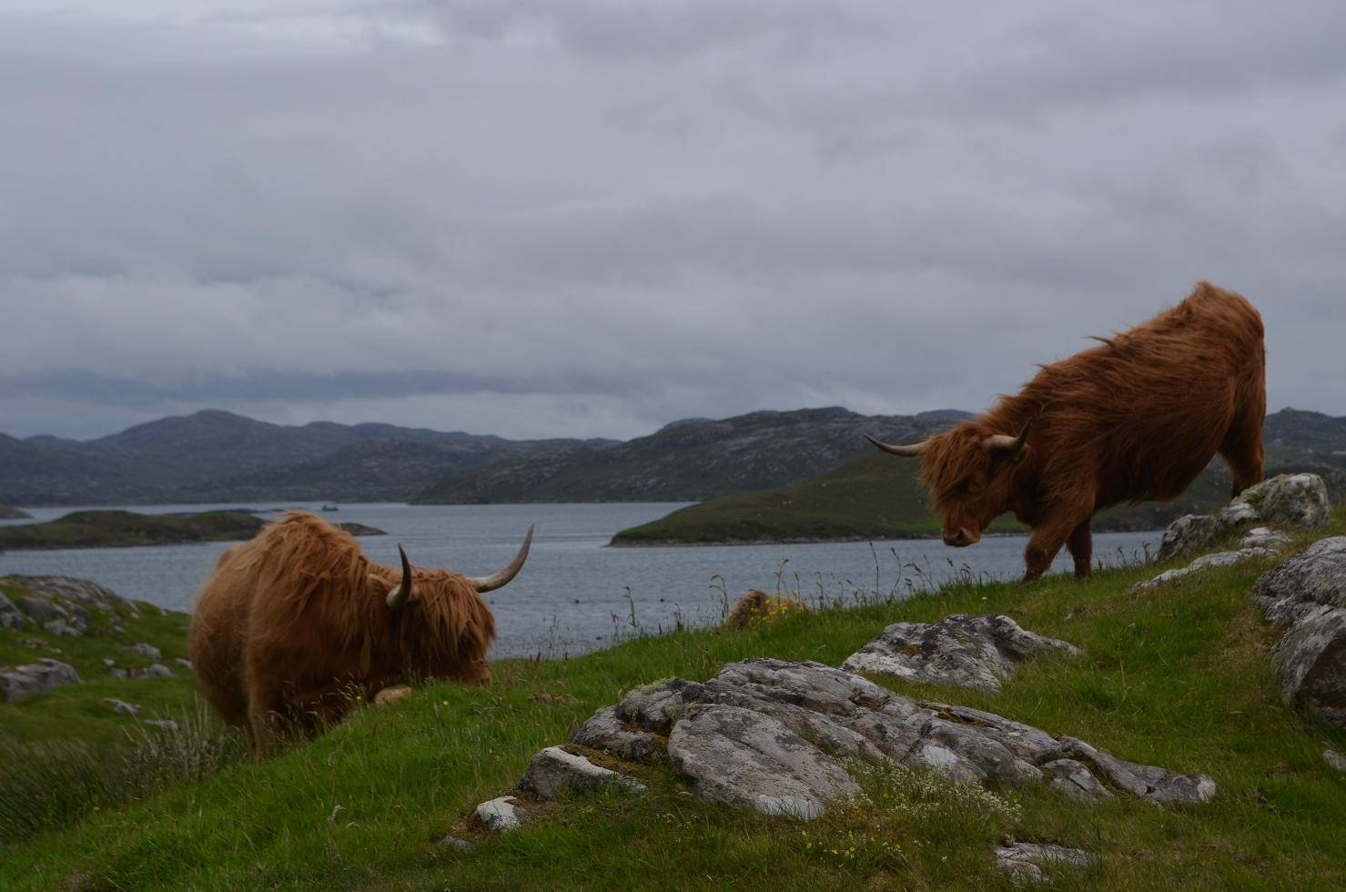 Landes dénudées tourbeuses parsemées de lacs, l'ile de Lewis diffère de Harris au sud ou c'est plus montagneux. En allant vers Butt of Lewis les maisons disséminées sont tristouilles murs gris et toit d'ardoises. Au port de Ness on observe les mouettes qui plongent en fusée pour choper les poissons. Et puis les phoques de la pointe de Lewis.