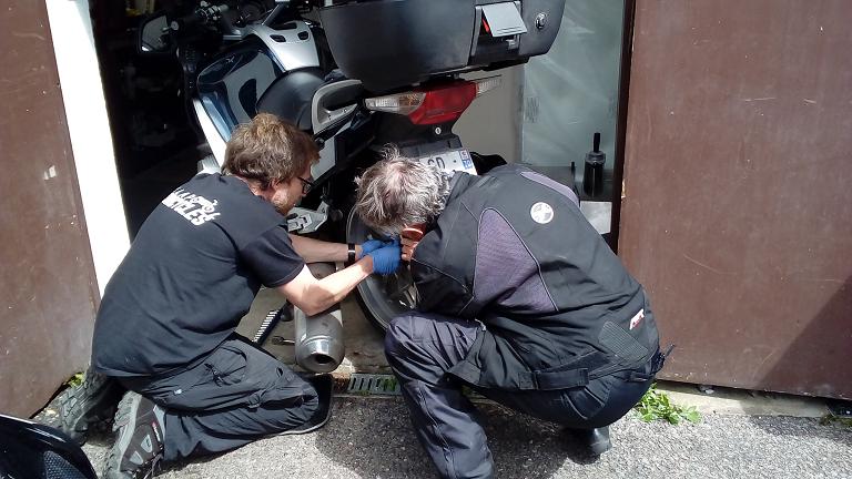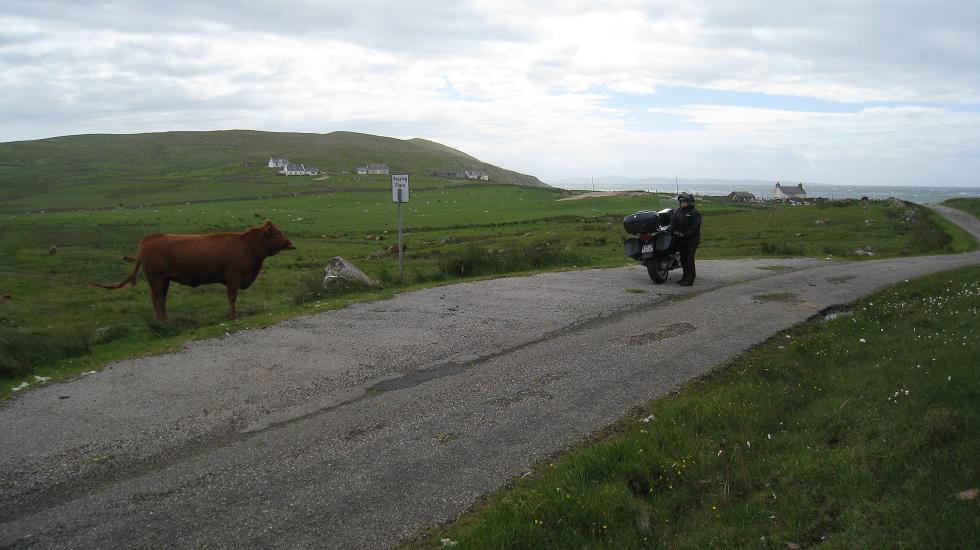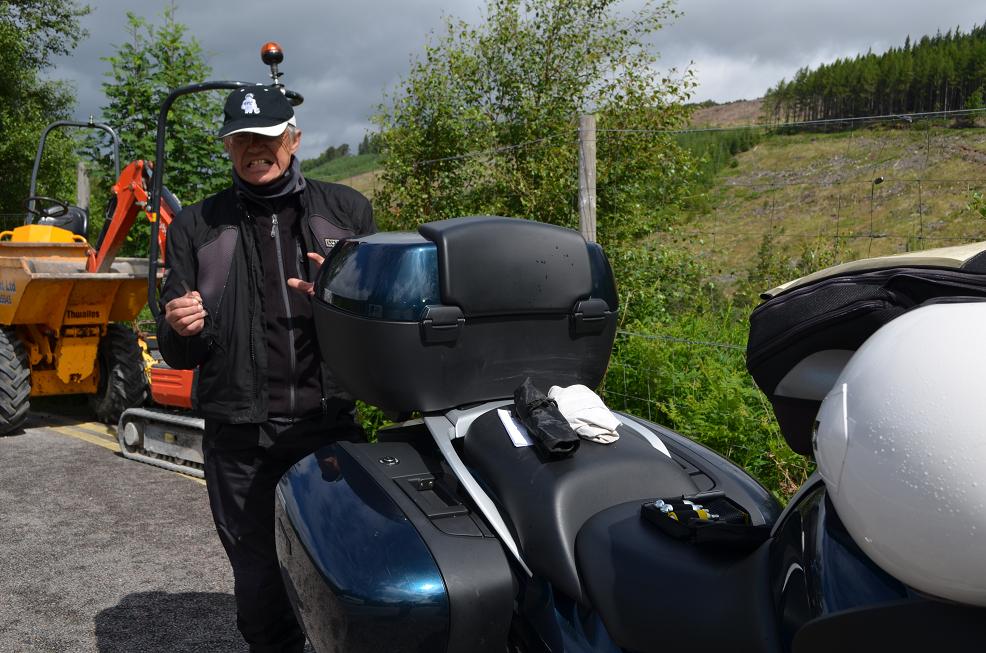 Et puis en reprenant la moto : damned pneu arrière crevé! Bon grande première, nous allons voir comment fonctionne le kit de dépannage de crevaison avec mèche et bombe de gonflage. Et bien c'est pas le top, après réparation j'atteint à peine 1 bar de pression avec les 3 bombes du kit (alors qu'il faut 2.9 bars). Bordzouille! De la merdasse ces bombes! Bon comme on n'est pas loin de "Hue la poule" comme dit Josy, on fait le trajet des 15 km à la vitesse d'un scooter boosté, les warnings allumés. Et puis on trouve miraculeusement un réparateur moto très sympa dans son minuscule garage qui nous répare la roue, top professionnel : Ian Simmons de Ullapool Motorcycles. Ouf on s'en sort bien, grosse bière pour fêter ça. J'imagine pas cette mésaventure au fin fond de l'ile de Lewis sur ces routes "one lane" ou il ne passe qu'une voiture tous les tremblements de terre. Et en plus s'il pleut...