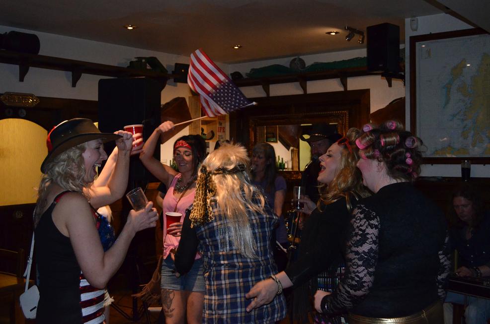 Le soir au pub, on réitère le test agréable de la pinte d'ale locale en écoutant un groupe écossais "The federals" qui joue du country. Vers 22H un groupe de jeunes débarque, tous plus bariolés les uns que les autres : chapeau de cow boy ou casquette Trump, short, veste à carreau, bandeau dans les cheveux, tenue miss America, pantalon fuseau lamé, bigoudis, veste simili zibeline, drapeau américain, teeshirt Trump!!! "tipi yahoooo tipi yahéééé"