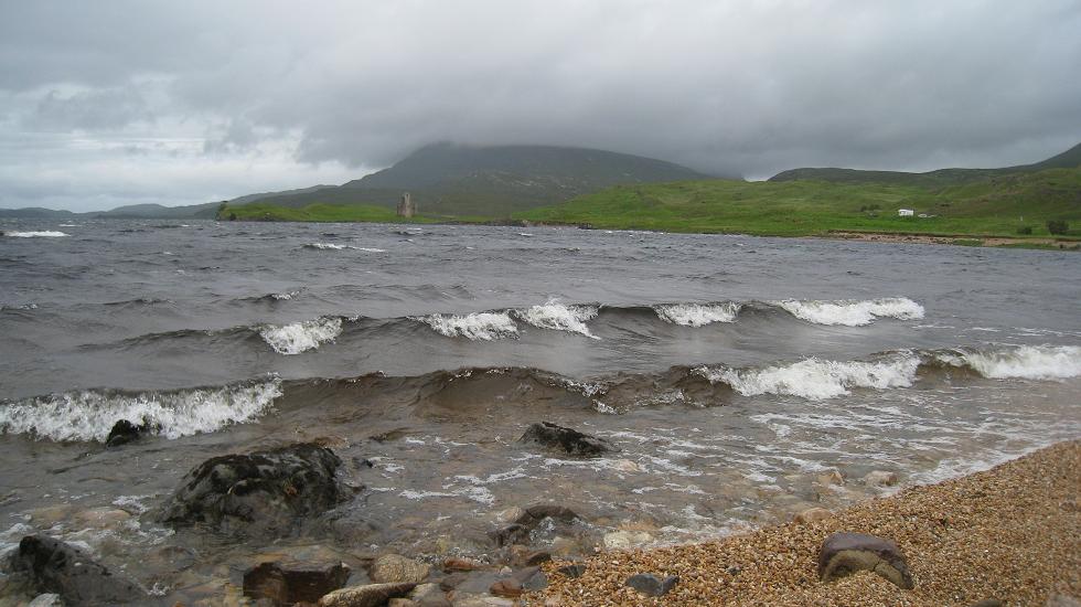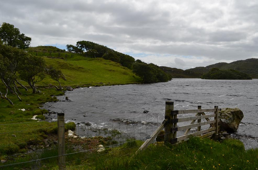 Sur un banc face au Loch, ciel nuageux avec quelques gouttes de pluie, marée basse, chien aboyant au loin, vent couchant les herbes hautes et les feuilles de mon carnet, bruit du vent, "pie pie pie" des oiseaux huitriers, écume lègère sur le loch, ciel menaçant à l'ouest tendance orageuse, moutons parsemés ici et là, "béé béé", B&B isolés, soleil momentané, trous de lumière. Ambiance!