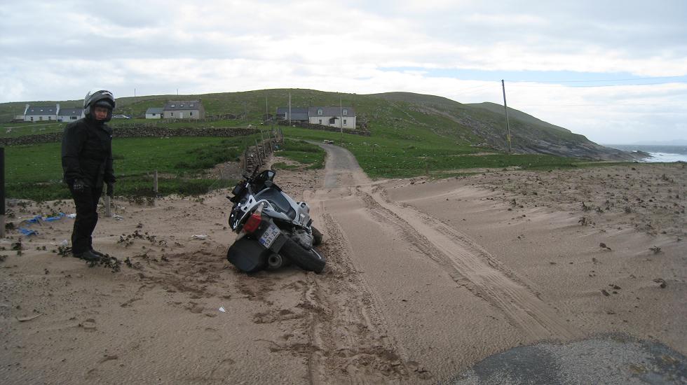 Etape dantesque comme disent les commentateurs du Tour de France. Petites routes "single lane" avec du vent en veux-tu en voila. La moto se soulève! (non, j'exagère), c'est seulement la Josy qui fait "ouh la la". On est quand même brinqueballés dans tous les sens. Et puis on veut en ajouter un peu en allant voir un phare, et là sur un passage de congère de sable je ne peux retenir la moto. Bon, pas de bobos, Josy était descendue avant le passage. Plus loin embouteillage.