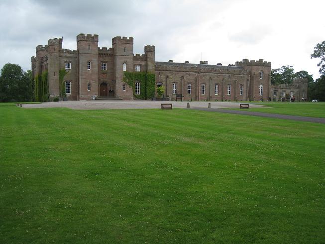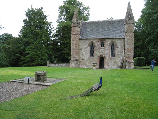 Visite du chateau de Scone ou tous les rois d'Ecosse furent couronnés sur la pierre de Scone (c'est une réplique, à gauche du paon).