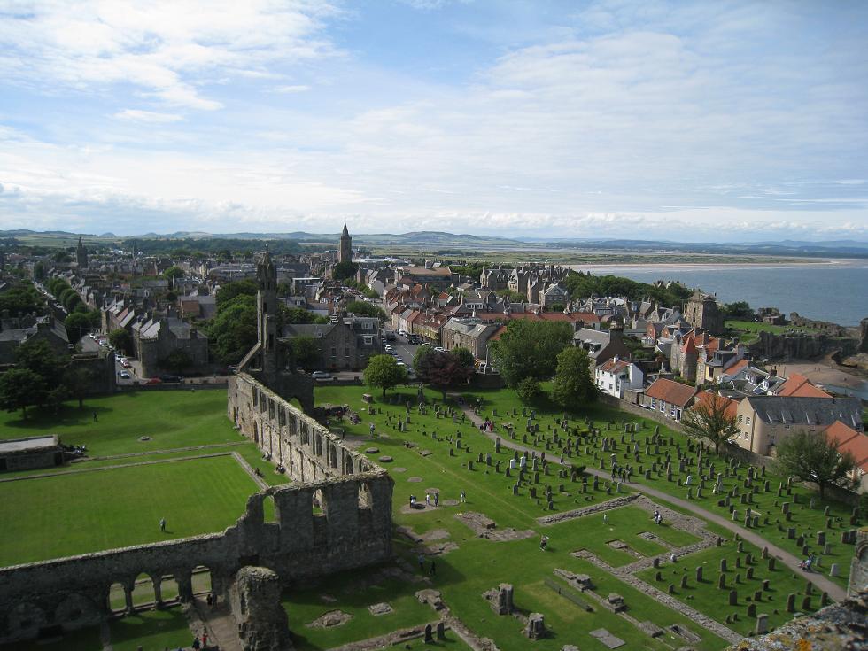 Vue de la ville avec en avant plan les ruines de la cathédrale.