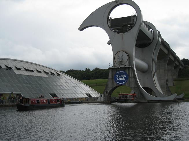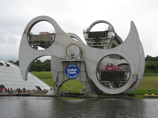 Raz l'bol des pierres et des chateaux, voici du bon métal dont on fait des oeuvres d'art : le Falkirk Wheel. Cet ascenseur à bâteaux en forme de roue absorbe une déclivité de 25m pour raccorder les canaux de Forth et Clyde. Ce bon vieux principe d'Archimède appliqué ici fait que le moteur de l'ensemble ne fait que 1500 watts, la puissance d'un fer à repasser!