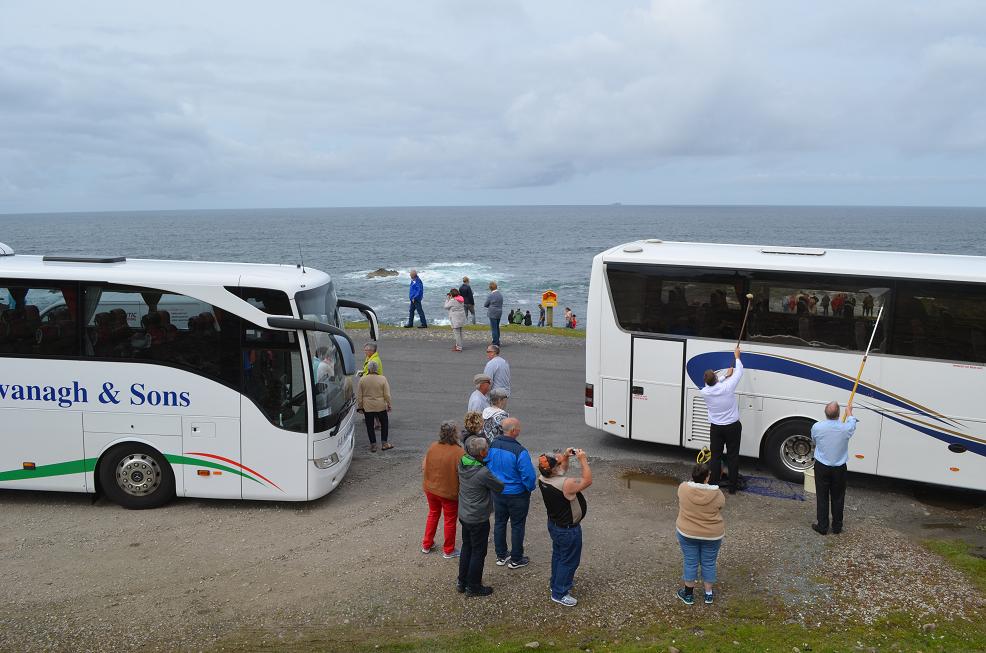 Les 2 chauffeurs sont en train de finir de casser une vitre latérale d'un bus!! En discutant avec un passager, le bus a longé un gros rocher et un caillou a giclé sur le bus et cassé la vitre. Etonnant, non? A moins que ce soit une farce d'un Leprechaun...