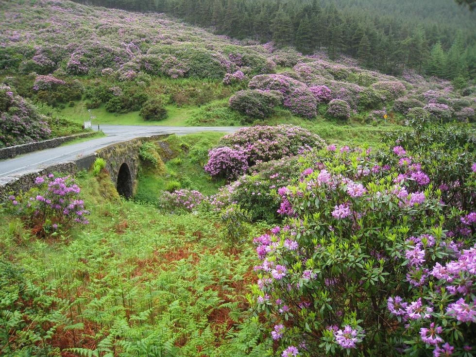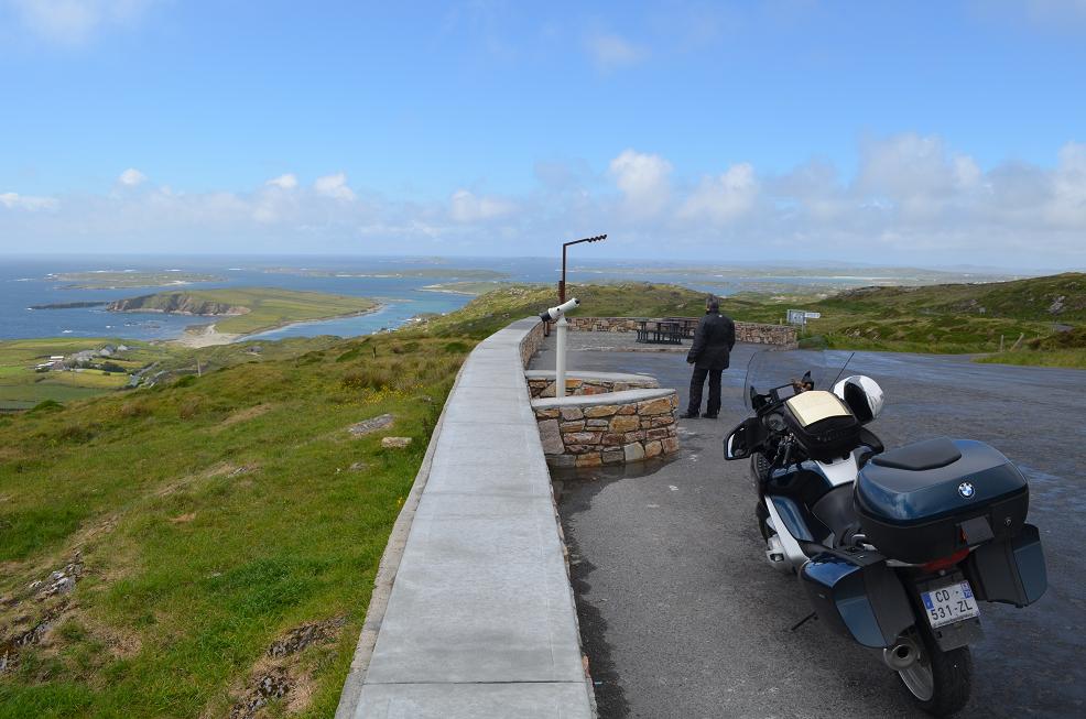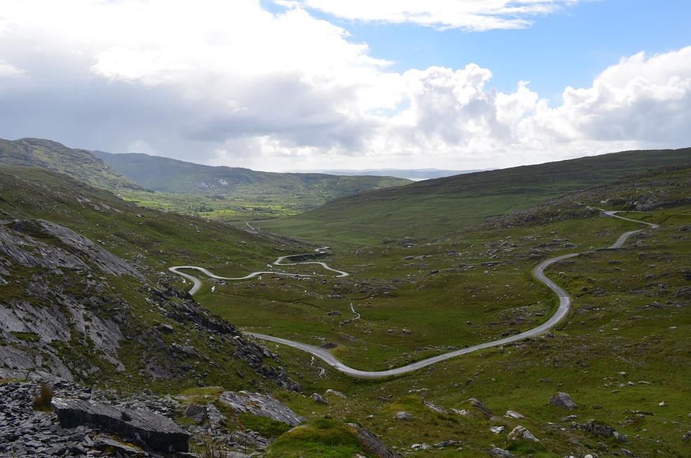Passage par le Healy Pass, route étroite en lacets qui traverse la péninsule de Beara. Au sommet du col vue sur la baie de Bantry d'un coté et le lac de Glenmore et la baie de Kenmare de l'autre. Cette route a été construite en 1847 pendant la période de la grande famine.