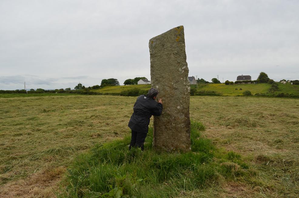 Les reins souffrent sur les petites routes en tole ondulée pour rejoindre la pierre orghamique de Breastagh. La pierre est en plein champ à 300m de la route, à priori pas d'accès avec ces murs de végétation de chaque côté de la route. Un peu plus loin se trouve une ferme.On demande au paysan si on peut approcher de la pierre. Sympa il nous guide dans sa ferme et nous montre le chemin.