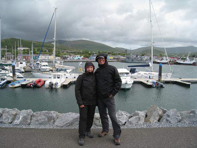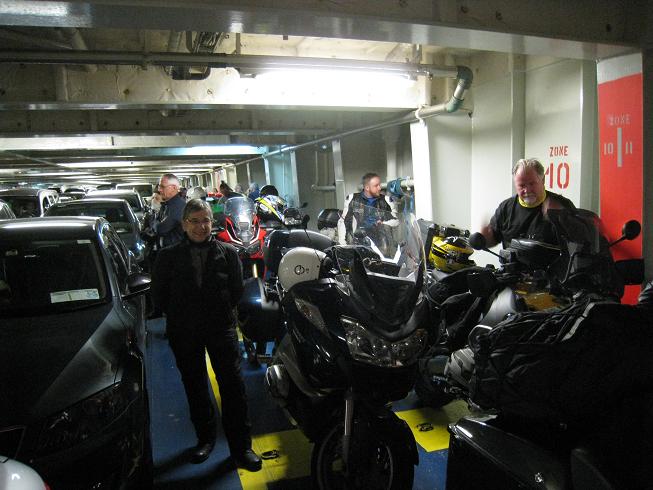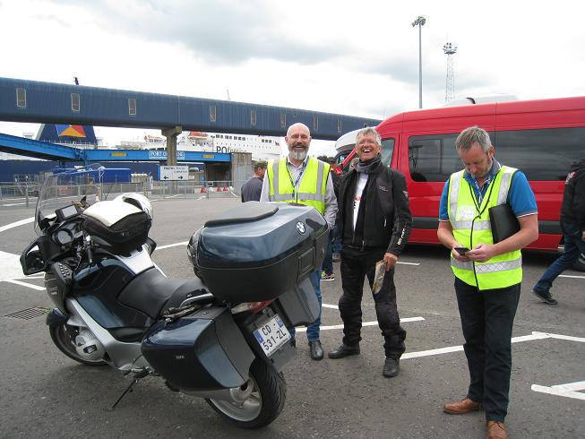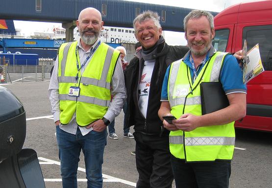 En attendant la sortie du ferry un motard irlandais (à droite sur la photo) nous aide à désangler la moto. Il est de Belfast, ville étape aujourd'hui des gros bateaux de croisière genre Costa, impensable il y a 20 ans.