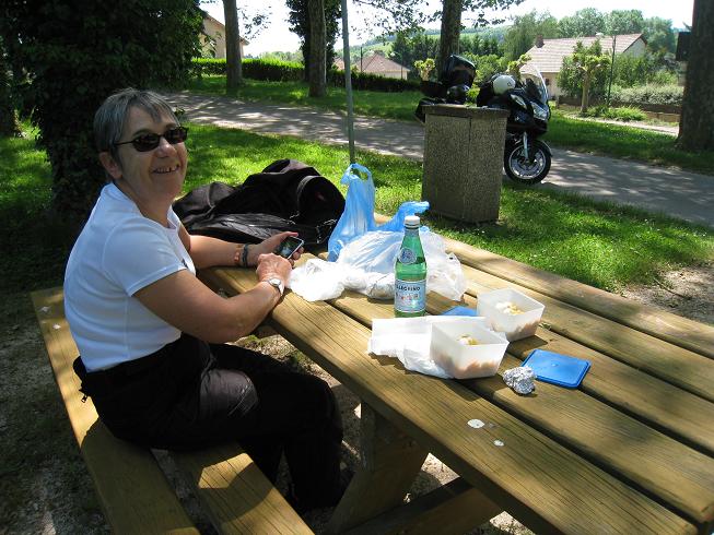 A Dijon le GPS nous cafouille 30km de rab. Faudrait quand même que je le mette à jour (2012). Vu dans les champs des éperviers factices sur fil de fer pour protéger les cultures. Ensuite un petit picnic à Pouilly en Auxois.