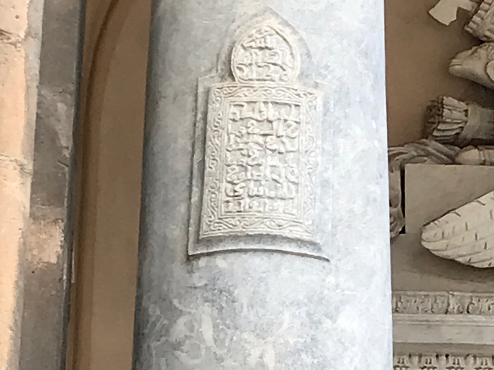 Le texte en caractère coufique inscrit sur la colonne de gauche dit ceci : "Il a créé la nuit et inventé le jour pour couvrir la nuit, les étoiles et les planètes, l'univers est donc son oeuvre, voudrions-nous qu'il n'en soit point le roi ?"