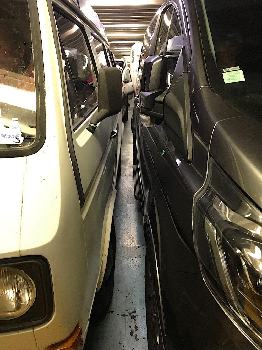 Le matin à l'arrivée à Toulon, on s'aperçoit qu'il est impossible d'approcher la moto, les voitures et camping car sont très serrés les uns contre les autres. On est obligés d'attendre que toutes les voitures sortent pour pouvoir se préparer. Pour finit on sort les derniers du ferry !