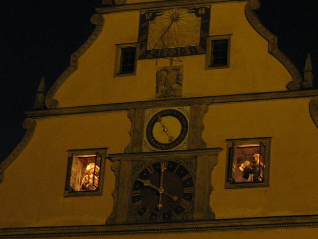 L'ancienne auberge des notables est certainement le bâtiment le plus connu de Rothenburg. L'horloge principale date de 1683. Toutes les heures deux fenêtres s'ouvrent sur deux figurines qui rappellent l' histoire de la "rasade magistrale" (Meistertrunk), une légende remontant à l'année 1631, lorsque les troupes catholiques attaquèrent la ville protestante de Rothenburg et s'en emparèrent. Le général catholique Tilly menaçait de piller la ville et de la saccager. Il promit d'épargner la ville si un notable parvenait à vider d'un trait un hanap de 3 litres 1/4 de vin. Le bourgmestre Nusch réussit cet exploit et sauva la ville qui fête cet événement chaque année à la pentecôte.