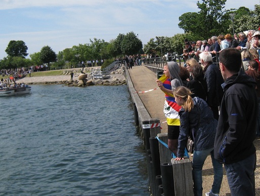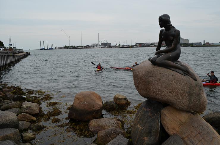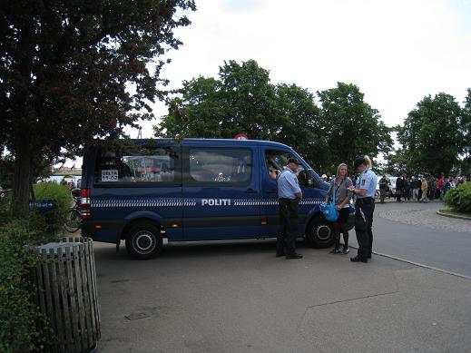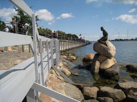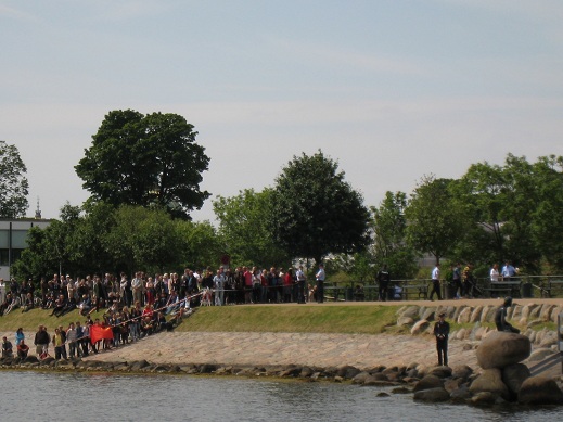 11H00, difficile d'approcher la petite sirène, l'emblème de Copenhague, des flics partout qui canalisent la foule. Une estrade a été montée spécialement pour que le président chinois Jintao, en visite dans la capitale, puisse approcher de la statue; mais évidemment impossible aux touristes de s'y aventurer. Au fur et à mesure que l'heure approche, les flics refoulent les touristes, des chinois brandissent le drapeau chinois : on est dans quel pays la!! Une militante courageuse brandit le drapeau tibétain au moment ou le président chinois passe au large sur un bateau. Mais elle est vite écartée par des chinois avec leur drapeau impérialiste. La militante est interpellée par la police et relachée. Nous prenons contact avec elle pour lui proposer nos photos (par email), mais elle est interpellée à nouveau au moment ou le cortège du président arrive par la route, et nous la perdons de vue... Le soir on repasse au même endroit, l'estrade est démontée.