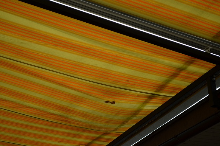 Réponse : une poche d'eau s'est formée sur la toile du store de la terrasse d'un restaurant.