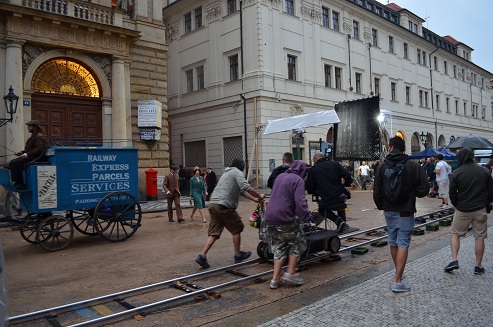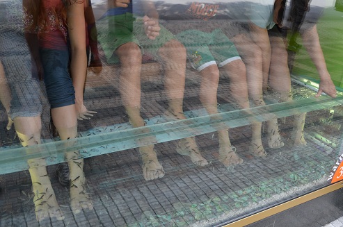 Images insolites : massage thaïlandais spécial - le nettoyage des pieds par des poissons - en vitrine dans la rue ; No photo! No flash! ... On tourne un film à Prague.